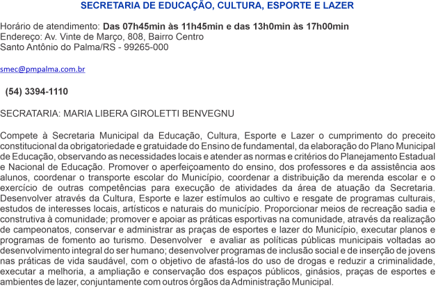 Av. Vinte de Marco, 808, Centro, Santo Antonio do Palma - RS - CEP: 99265-000