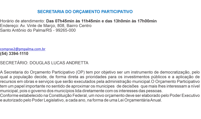 Telefones: 5433941110 - 5433941111CNPJ: 92.412.832/0001-33Email: administracao@pmpalma.com.br
