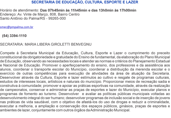 Telefones: 5433941110 - 5433941111CNPJ: 92.412.832/0001-33Email: administracao@pmpalma.com.br